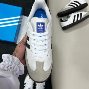 O Adidas Samba Premium Branco e Preto é um sneaker clássico com estética retrô e construção moderna. O cabedal em couro parcial com sobreposição em camurça reforça as áreas de maior desgaste e aumenta a durabilidade do calçado. O solado em borracha proporciona ótima aderência e estabilidade para uso urbano diário.