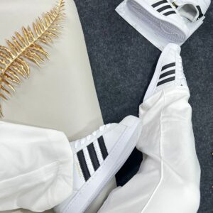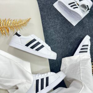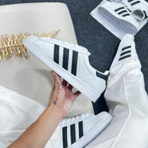 O Adidas Superstar Branco e Preto Premium combina tradição, resistência e estilo atemporal. Seu cabedal estruturado, inspirado nas versões clássicas em couro, oferece durabilidade e conforto para uso diário, enquanto o solado em borracha proporciona aderência e estabilidade.