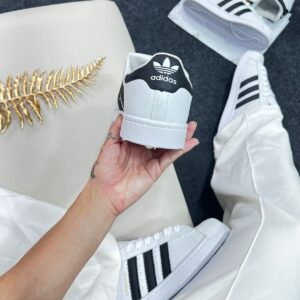 O grande destaque do modelo é a icônica biqueira shell toe, criada para proteger os dedos e aumentar a resistência do calçado — característica que tornou o Superstar famoso mundialmente.