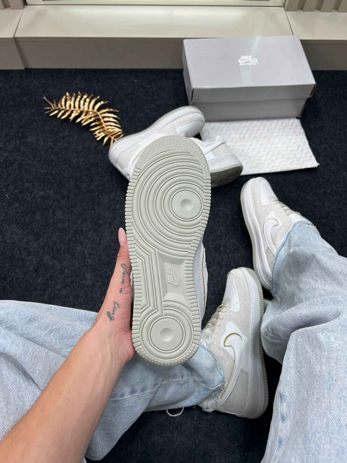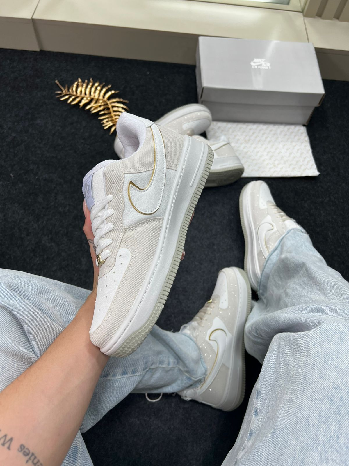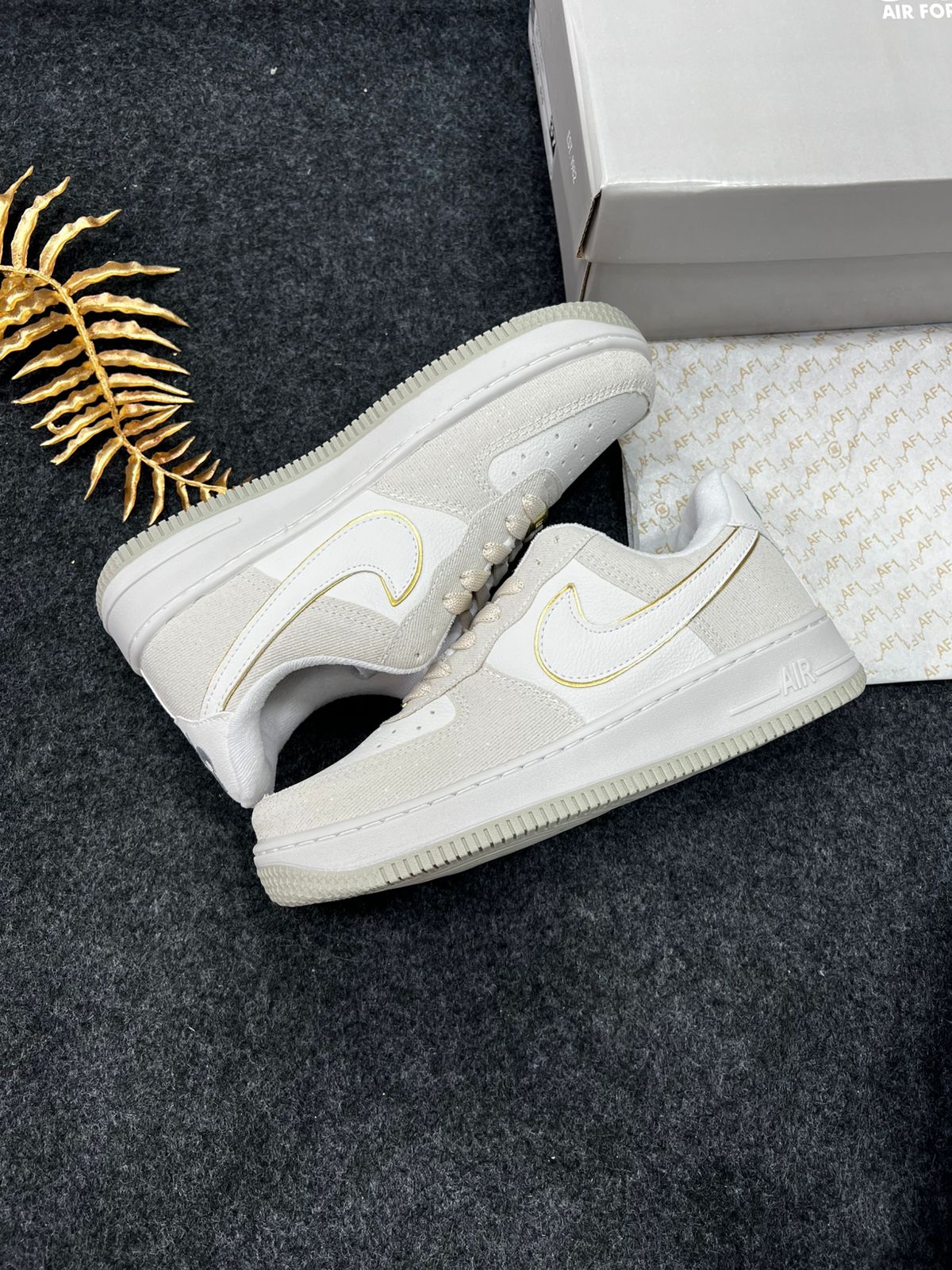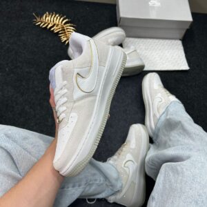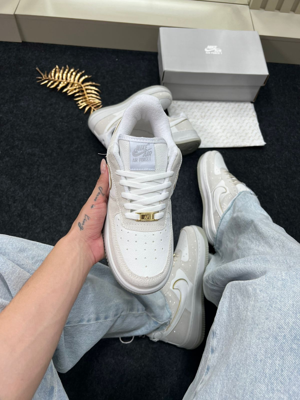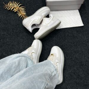 - Modelo/base: Nike Air Force 1 Premium (“Triple White” / variações claras) — nesta cor “Areia Brilhante”.