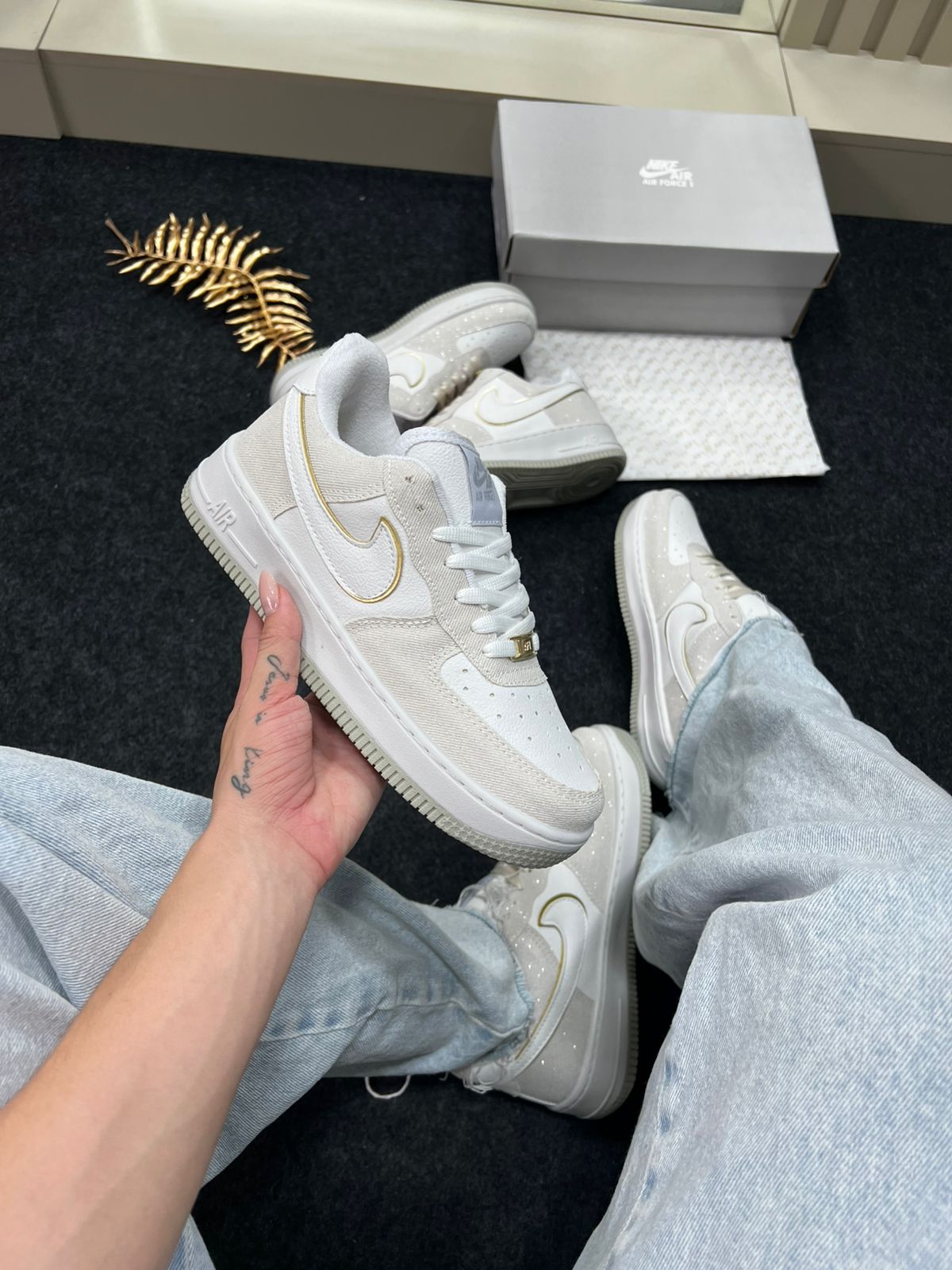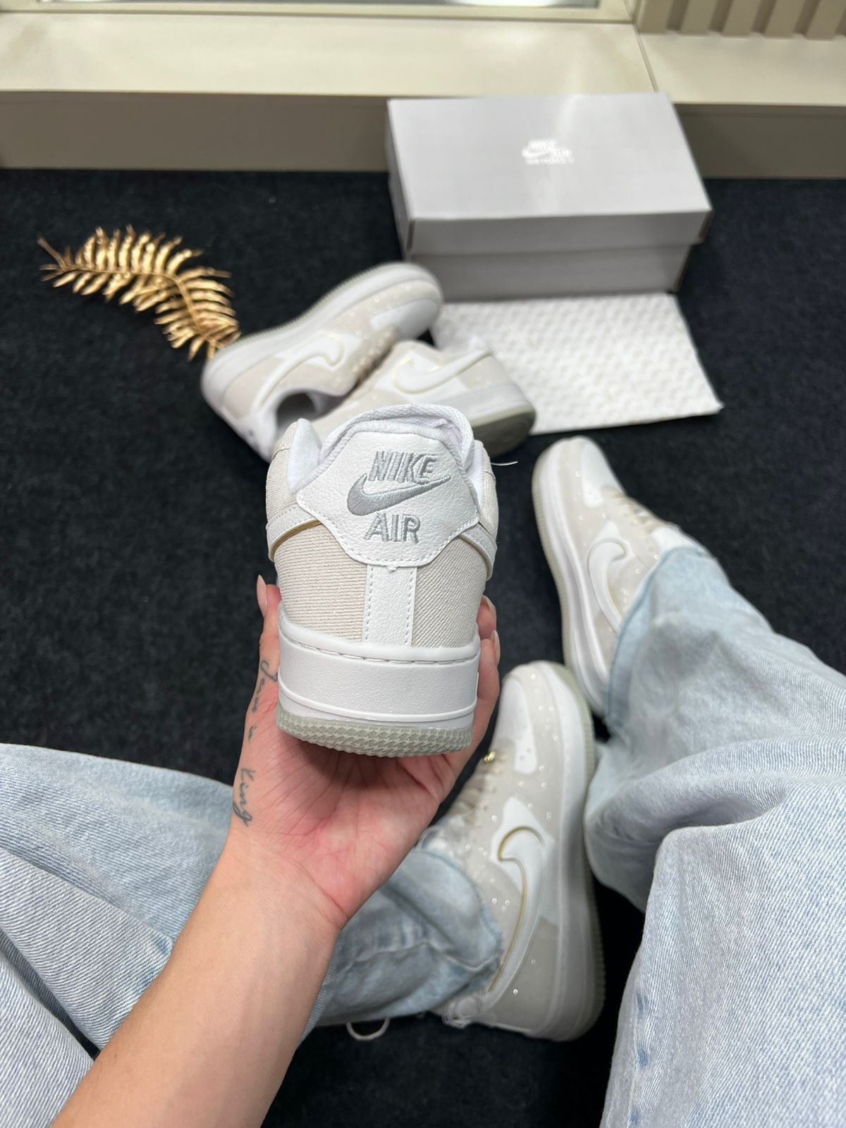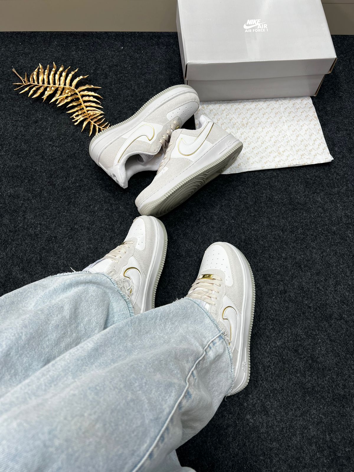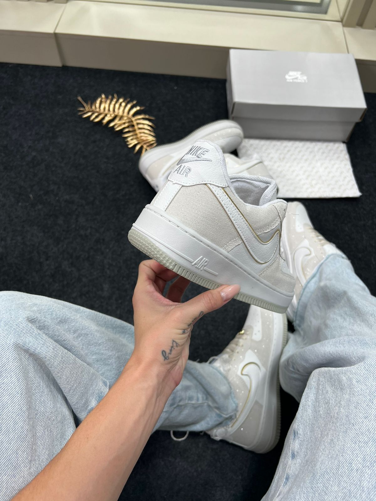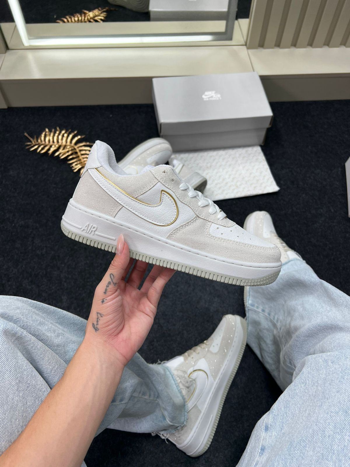 - Modelo/base: Nike Air Force 1 Premium (“Triple White” / variações claras) — nesta cor “Areia Brilhante”.