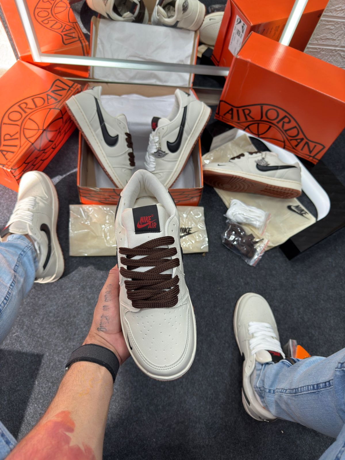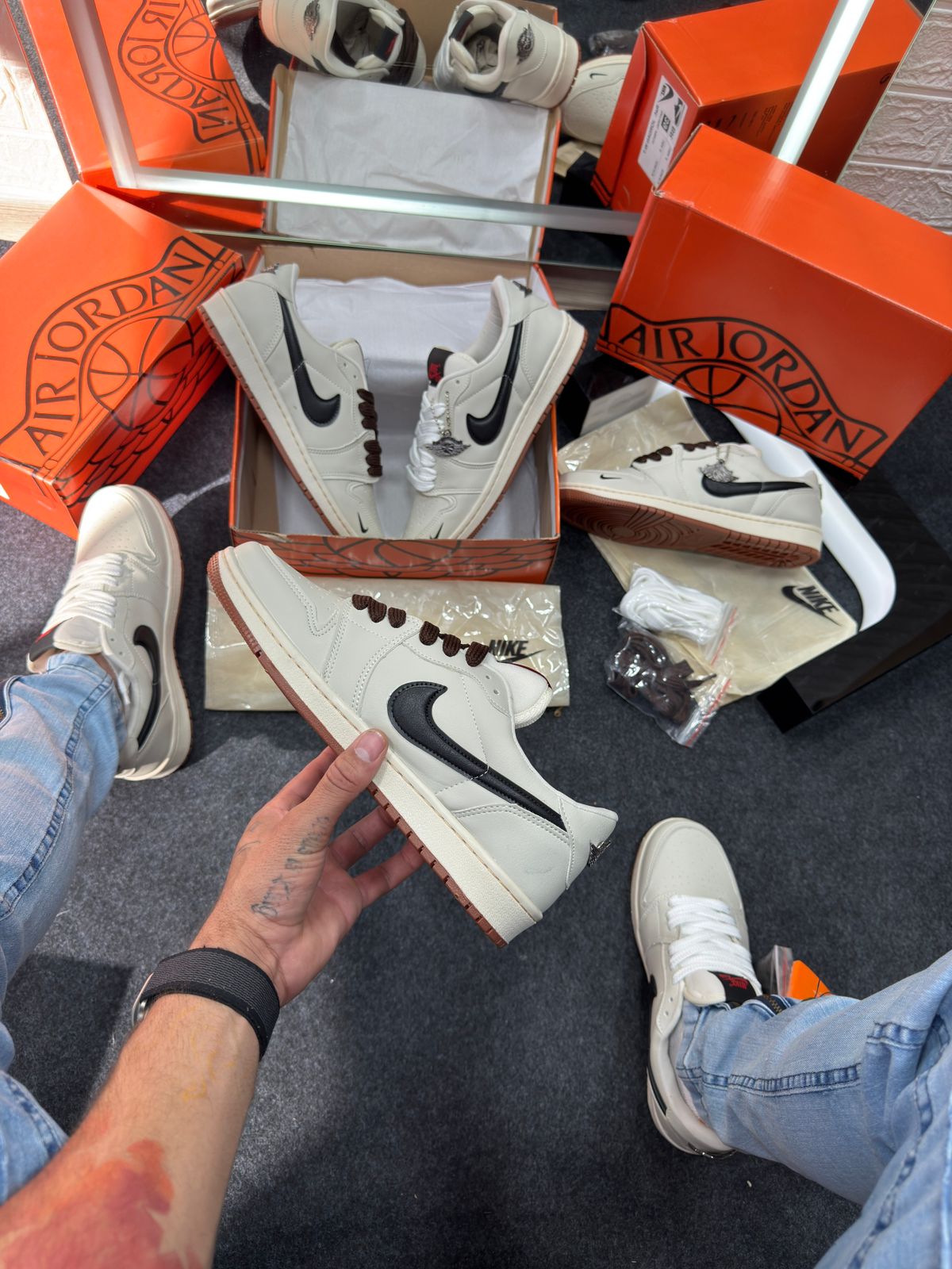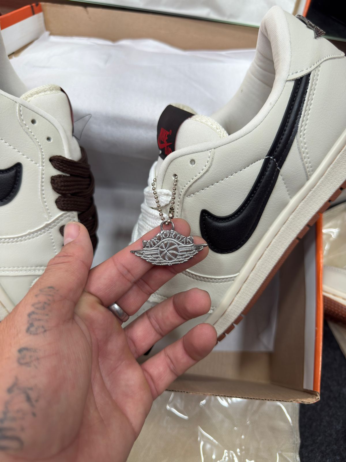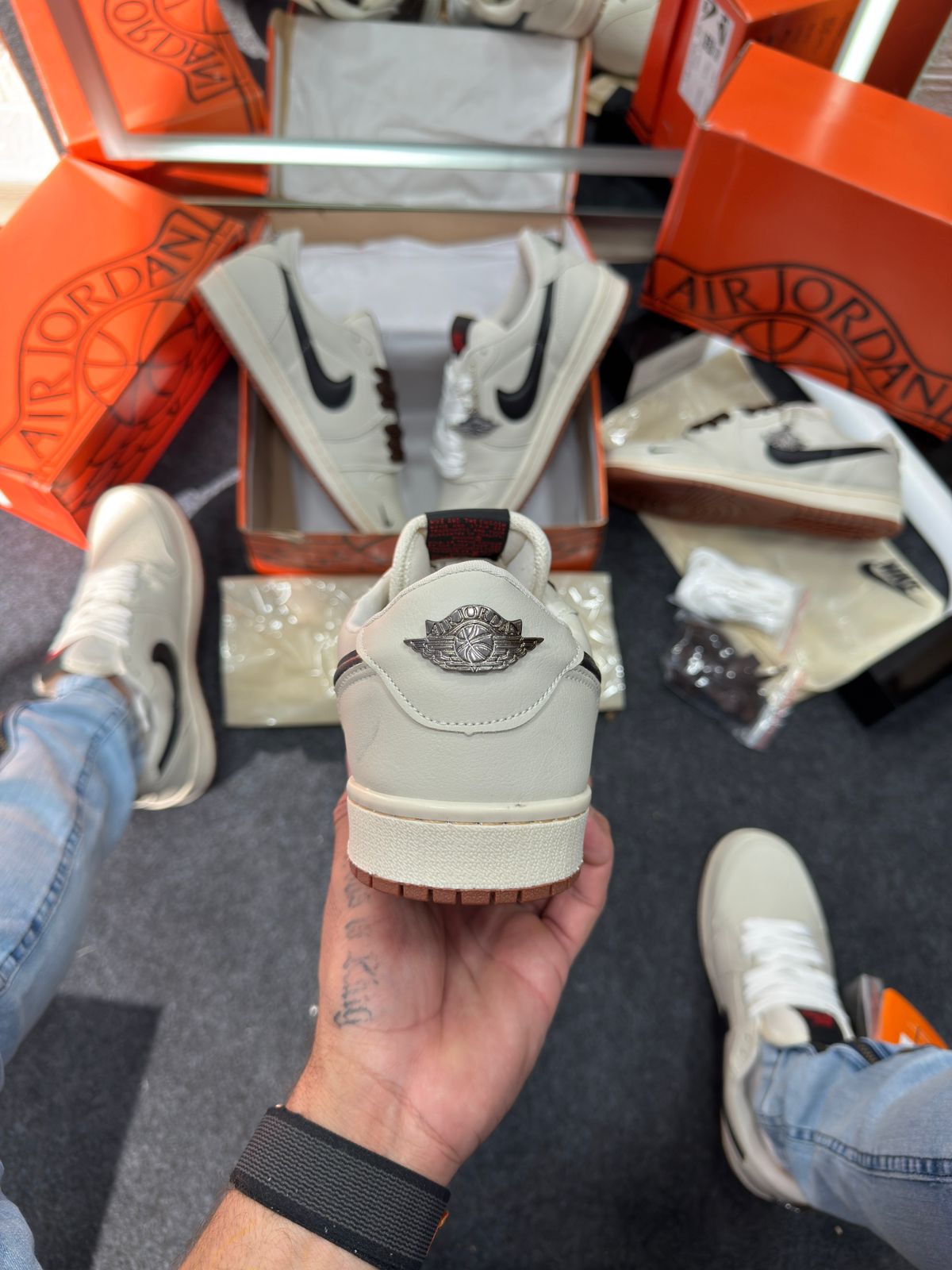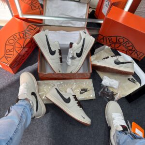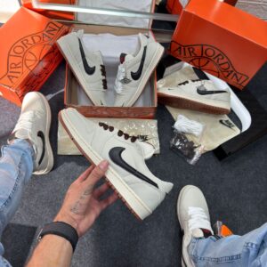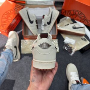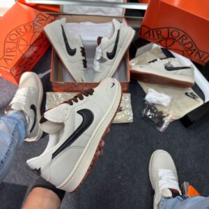 - Cabedal em couro cru “off-white” com painéis em preto e detalhes minimalistas, refletindo a estética “deconstructed” já explorada por versões Off‑White das Jordan 1.