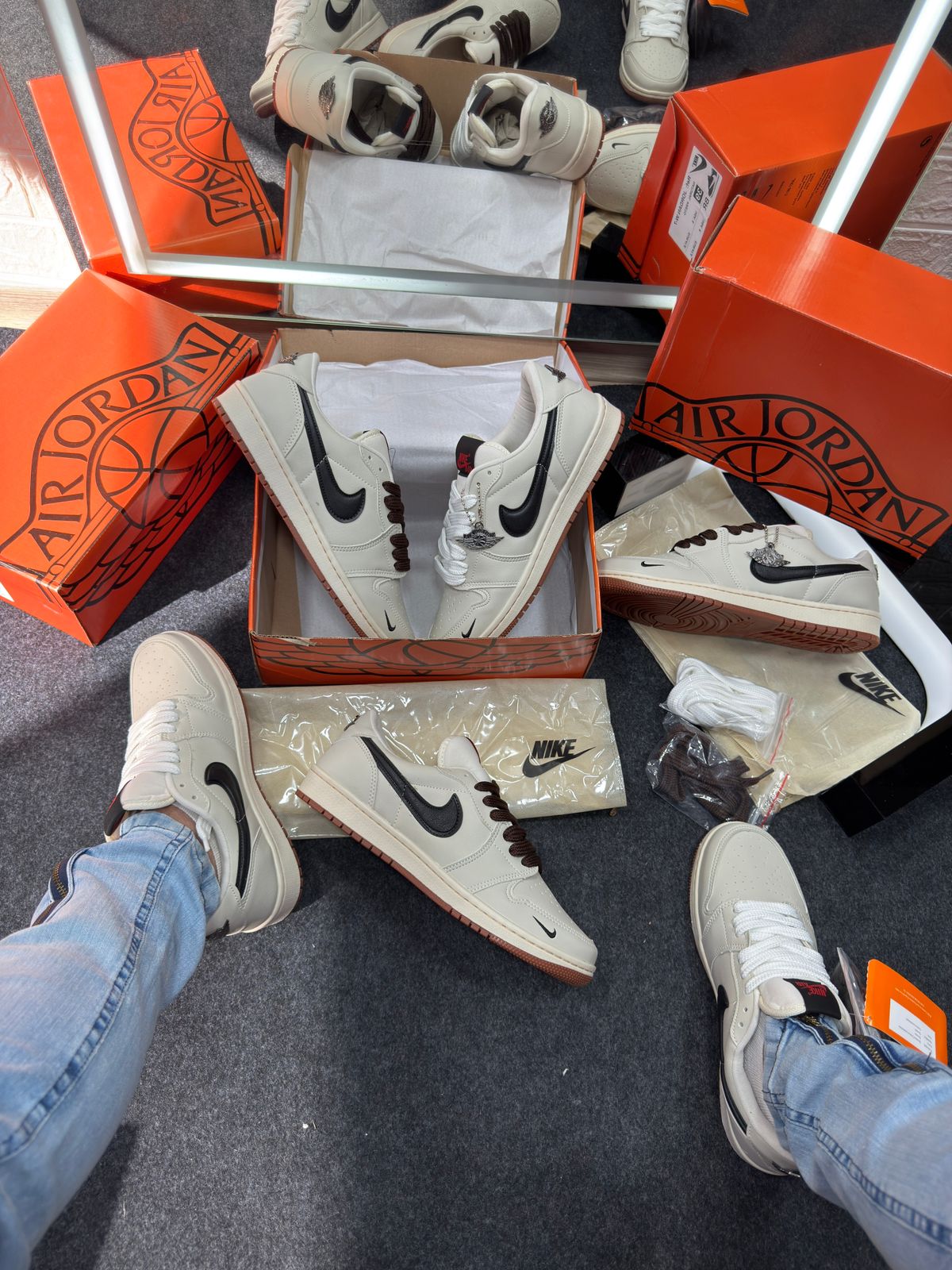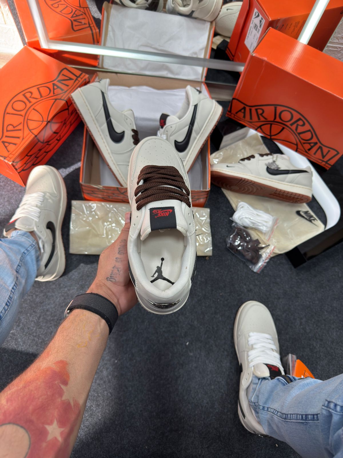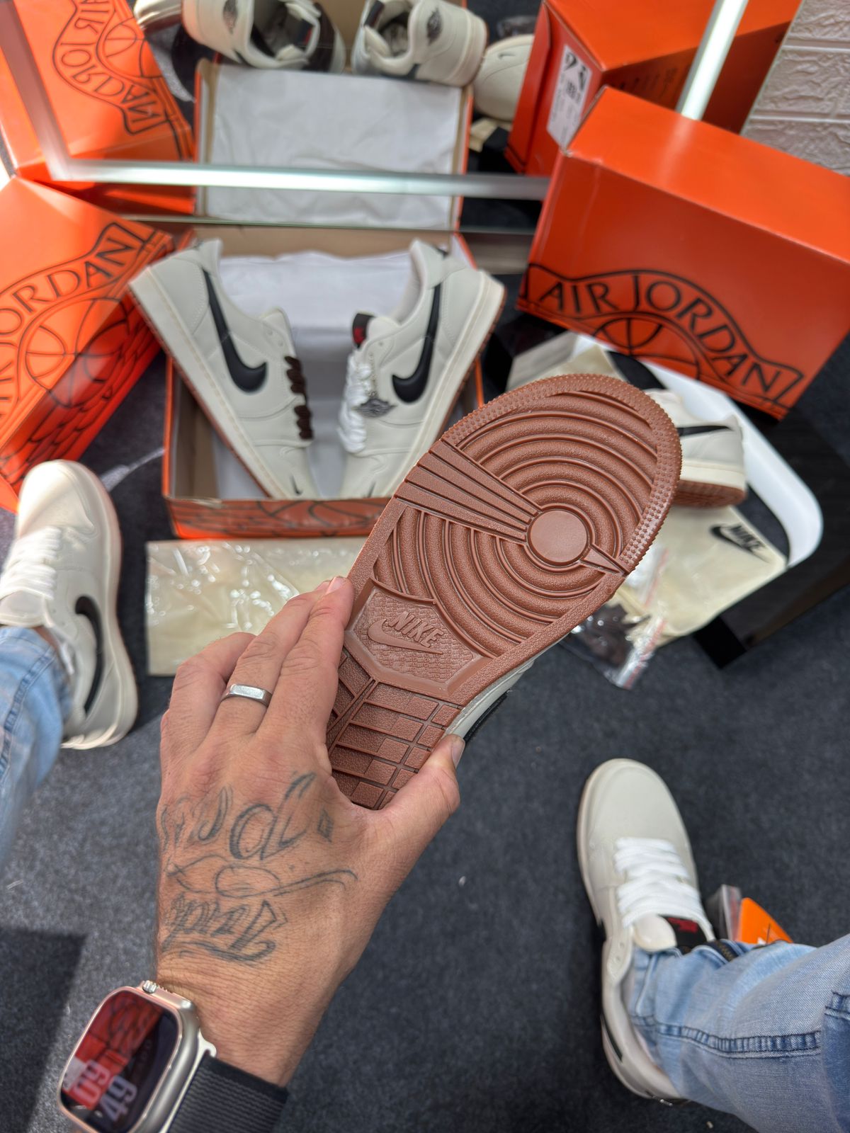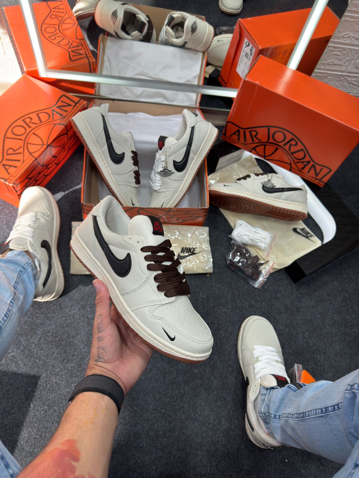 - Cabedal em couro cru “off-white” com painéis em preto e detalhes minimalistas, refletindo a estética “deconstructed” já explorada por versões Off‑White das Jordan 1.