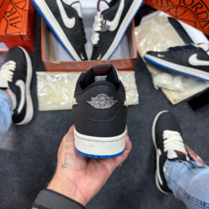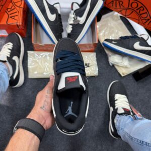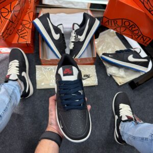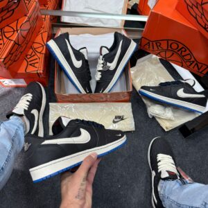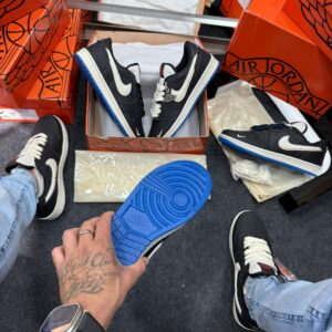 - Detalhes Jumpman e Wings em azul, reforçando a identidade reconhecida da Jordan Brand e conferindo elegância sutil ao design.