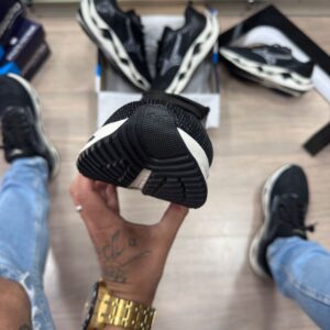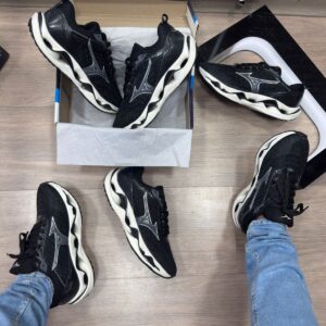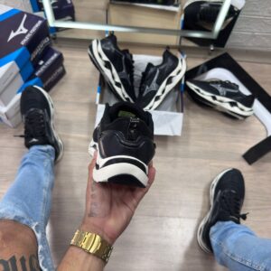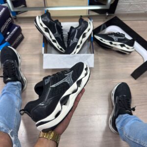 O Mizuno Wave Stratos em versão preto e branco é um tênis de corrida e lifestyle com design moderno e tecnologias avançadas, ideal para atacadistas que buscam um produto de alta performance e visual versátil atrativo para todos os públicos.